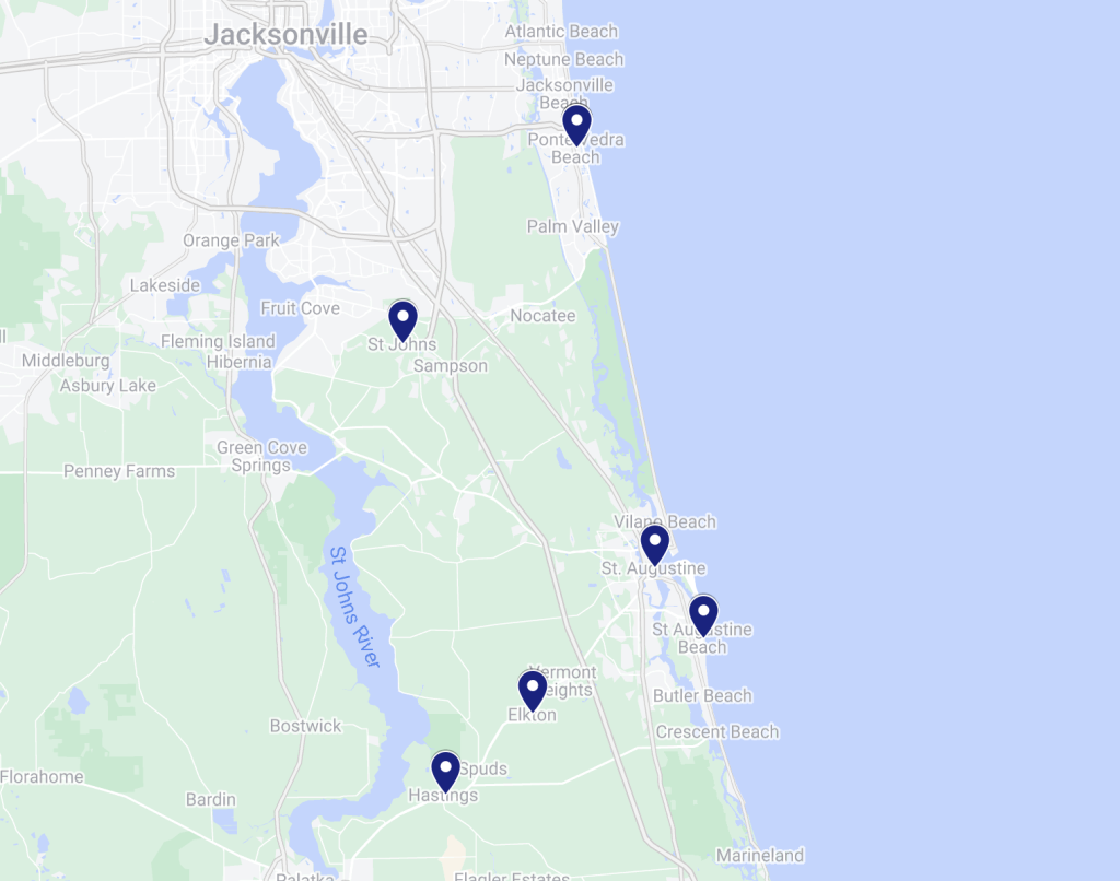 Service Areas SERVICE AREAS Areas We Serve East Palatka Ponte Vedra Saint Johns Elkton Ponte Vedra Beach Hastings Saint Augustine Palatka Saint Augustine Beach